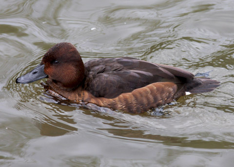 little sexual dimorphism; this diving duck that is chestnut-brown (drake) or darker brown (hen) in plumage all over, except for the bright white undertail coverts; frequents fresh or slow-moving brackish water fringed with vegetation.