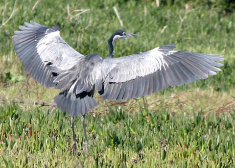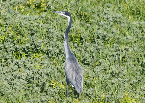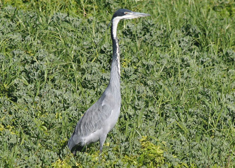 a medium-sized heron of grasslands, scrublands, and marshes; slightly smaller than Grey Heron and with more black on the head and neck; little sexual dimorphism.