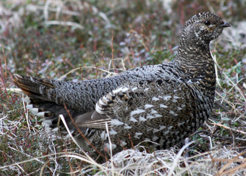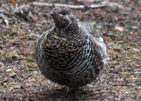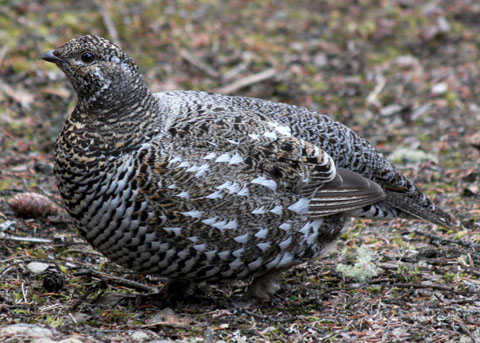 a tame bird that inhabits dense spruce woods with mossy ground; incredibly well camoflaged; some sexual dimorphism, with breeding male having a black neck and breast.