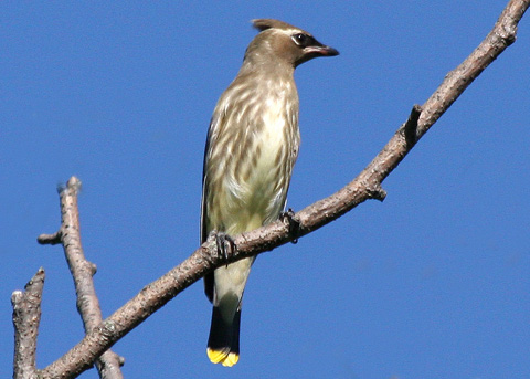 a sleek and seemingly well-groomed bird with a crest and warm-brown plumage; eats berries, and sometimes gets drunk when ingesting too much over-ripe fruit; also catches insects on the wing; forms mid-sized flocks that like to perch in the topmost branches of bare trees; often first detected by its high and thin vocalizations that sound like sreee, issued in flight as well as when perched.