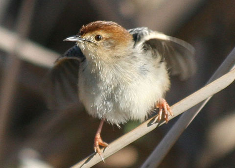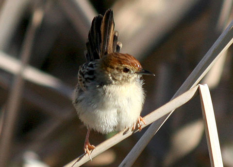 cisticolas comprise a large family (Cisticolidae) with more than 100 species in Africa and Australasia; they are small warbler-like or sparrow-like birds mostly inhabiting dry grasslands; usually found alone or in pairs; many of these species are secretive and difficult to distinguish in the field; insectivorous; usually not sexually dimorphic; like many other cisticolas, Levaillant's Cisticola has a long tail; native to extreme southern and south-central Africa.