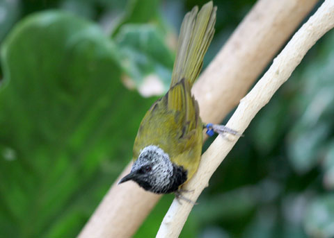 speckled grey head; black throat; yellow belly (Zoo; 2012-10-09)
