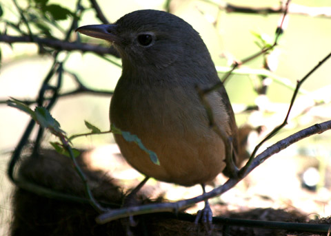 brownish all over; rather large bill; orange iris (Australia; 2006-07-02)