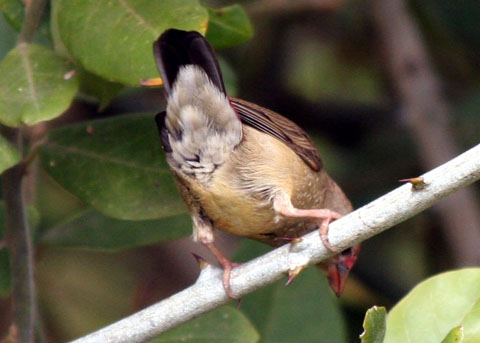 seen in pairs or small parties in mixed bushveld of southeastern Africa, especially near watercourses; can be told from other firefinch species by the pinkish bill in both sexes and by the fact that the female is mostly greyish underneath as opposed to mostly reddish in other firefinch species.
