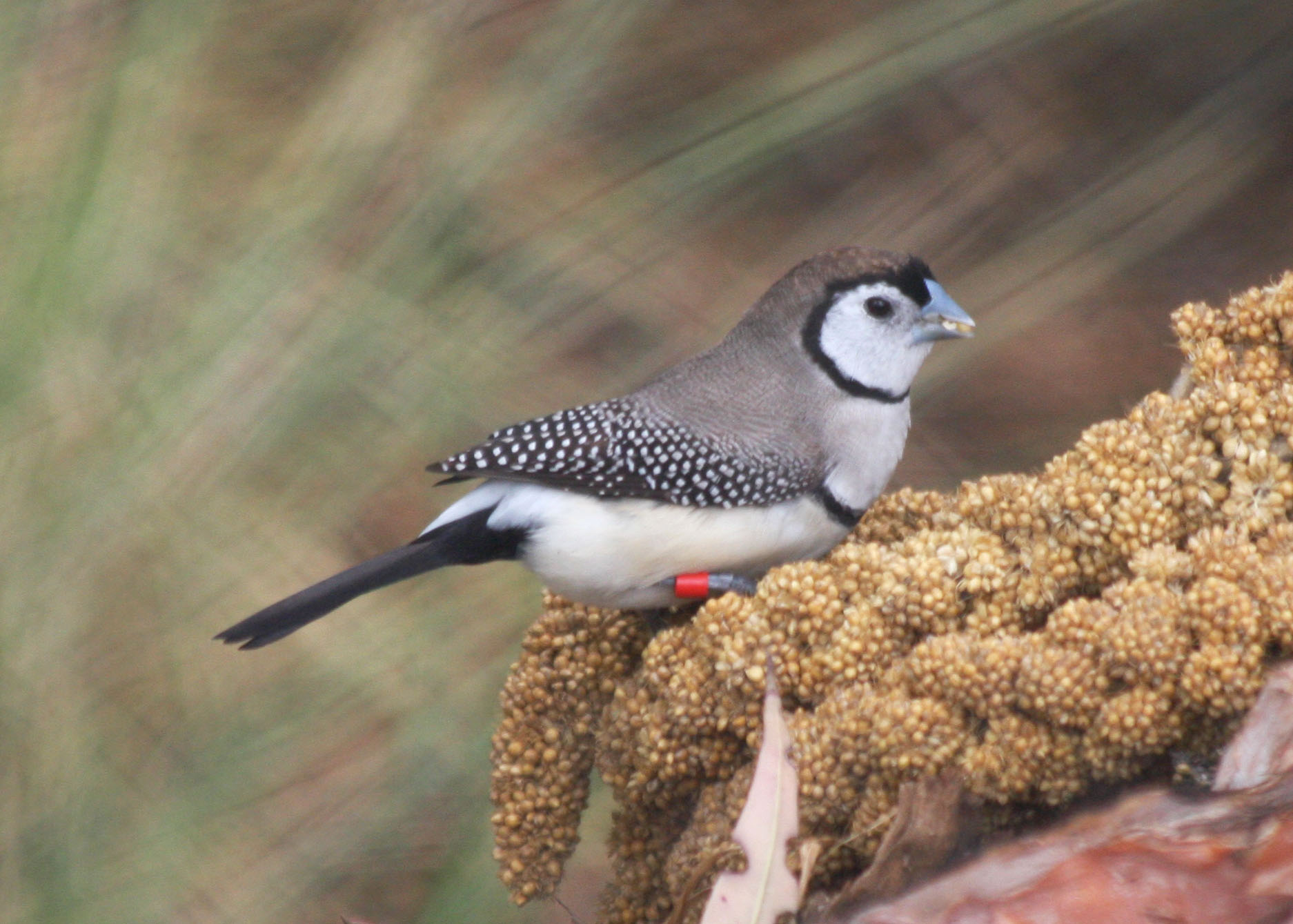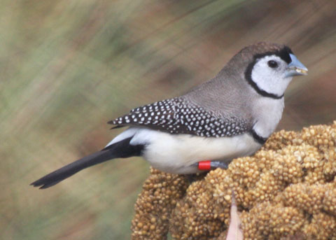Double-barred Finch Taeniopygia bichenovii Native Range: Australian Region Notes: inhabits dry grasslands and scrublands of northern and eastern parts of the Australian continent; no sexual dimorphism.