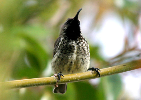 with respect to ecology, sunbirds in several ways are Old World analogues of hummingbirds in the Americas; they are small active birds, often brightly colored with irridescence, that have a long (and often decurved) bills for sipping nectar; in doing so, they also pollinate the plants they visit by inadvertently transferring pollen from one plant to another (often on their face or forehead); also like hummingbirds, most sunbird species show strong sexual dimorphism with males being more brightly colored than females; for the Scarlet-chested Sunbird, the female (pictured below) fails to show the bright red breast of the male (who is not pictured).