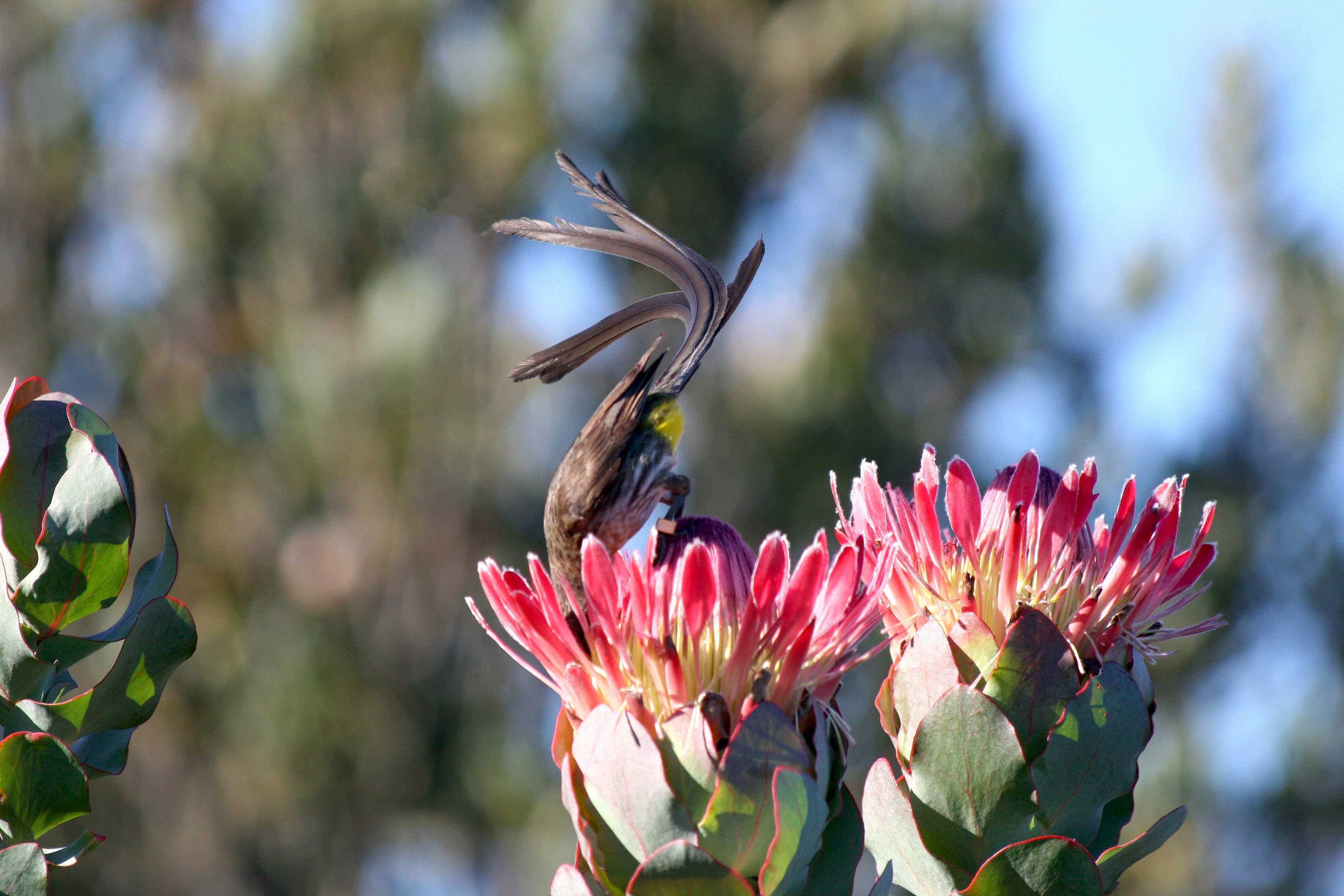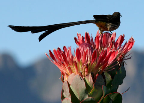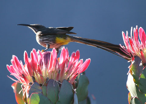 sugarbirds (of which there are only two extant species in the family) are long-tailed nectar-feeding birds endemic to southern Africa; they are ecologically quite similar to honeyeaters in Australia but phylogenetically they are distant cousins of sunbirds; this species is confined to the extreme southern tip (Cape region) of Africa where it forages in gardens and coastal scrublands.