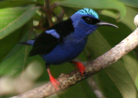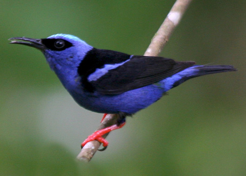 Red-legged Honeycreeper Cyanerpes cyaneus Native Range: Latin America Notes: a small and stunningly beautiful tanager with red legs and a rather long decurved bill; shows strong sexual dimorphism.